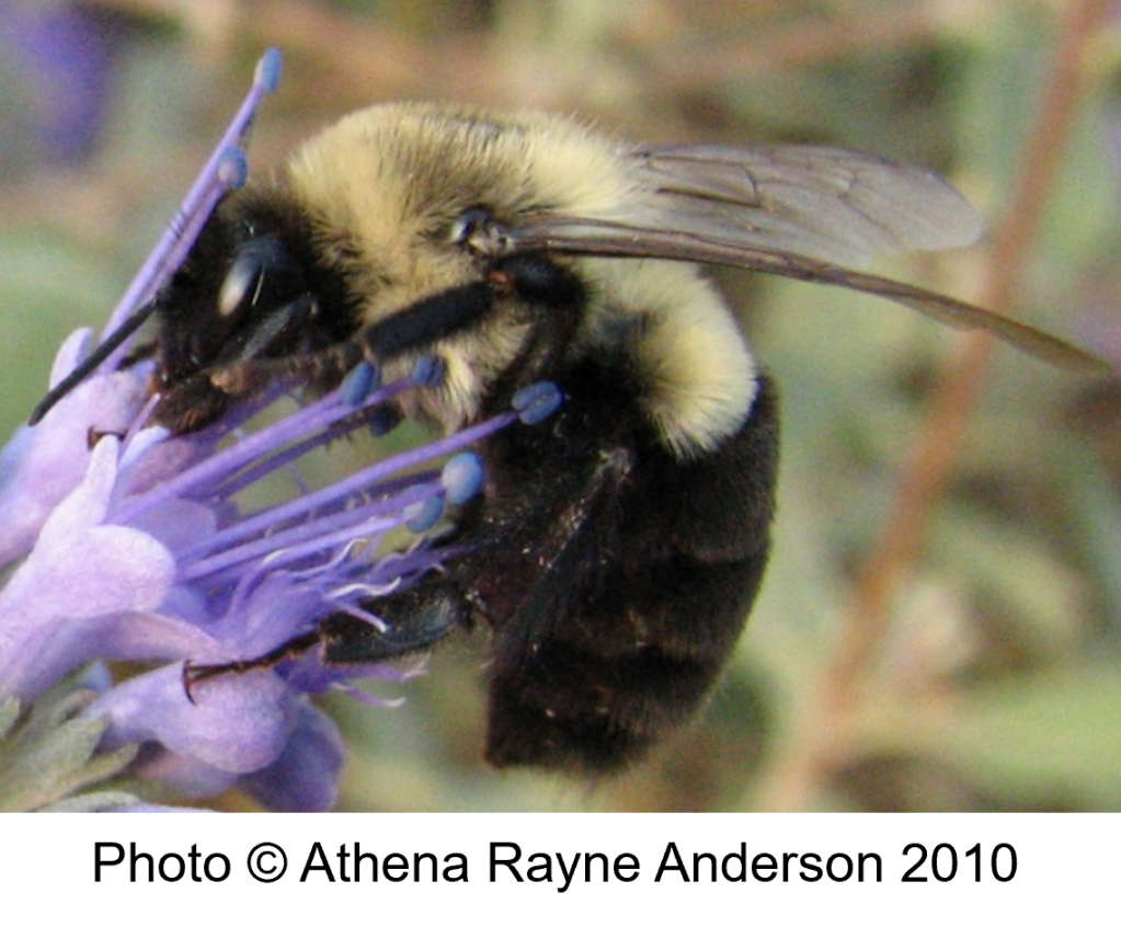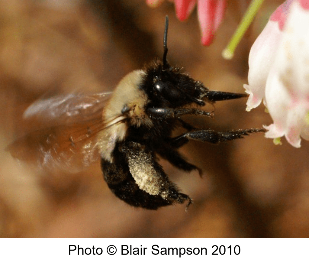 These bees are unique to the coastal plain region of the southeastern U.S. They tend to be about honey bee-sized, and look very similar to a bumble bee in coloration. However, as you can see in the photo here, females carry pollen in a scopa on their hind legs, just like carpenter bees. If you see a small bee with a fuzzy abdomen and its scopa on its hind legs, it’s probably a blueberry bee. Like their name suggests, these bees are specialists on blueberries, and are more efficient at pollinating these crops than honey bees! Females nest in bare, sandy soil, and these bees are only active during blueberry bloom- usually very early in spring.