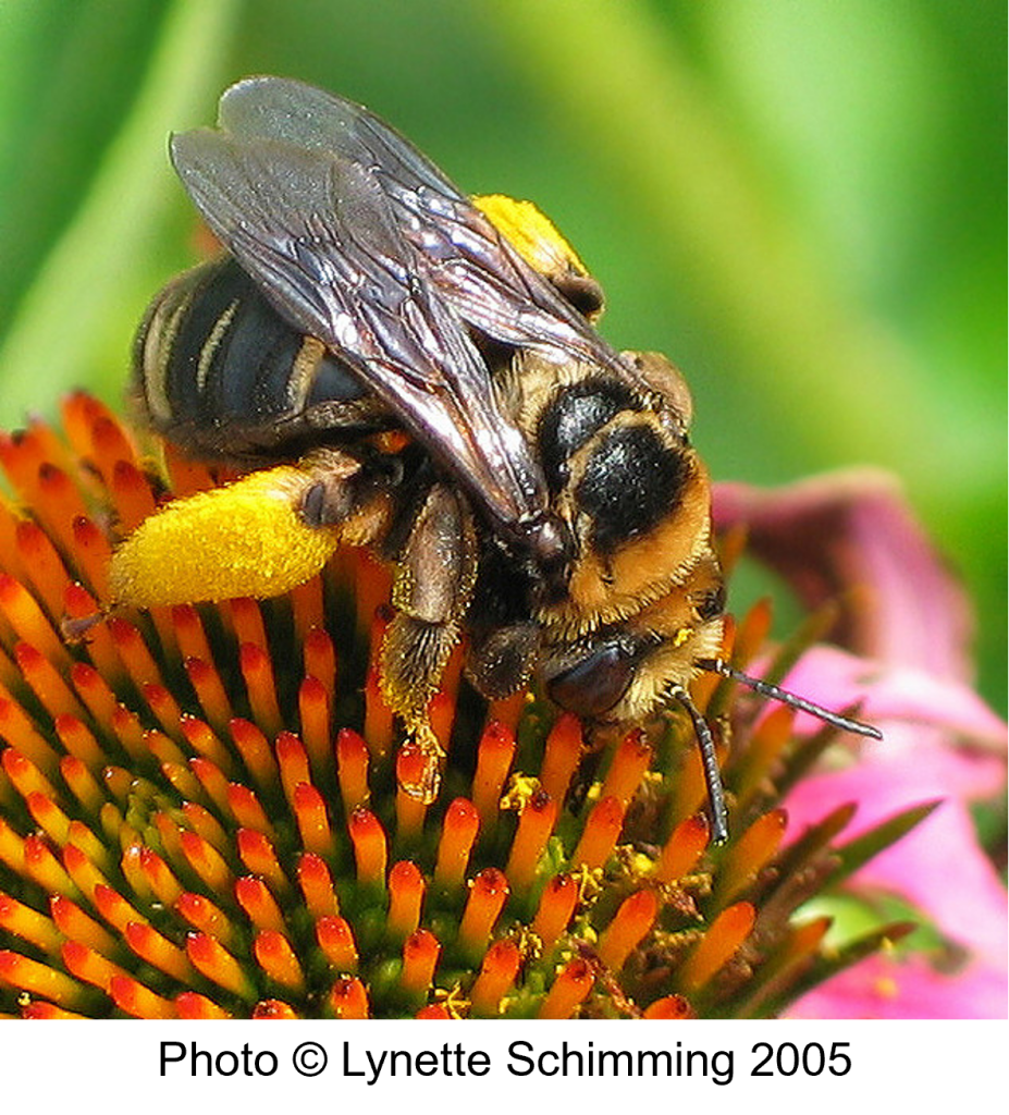 These bees are not as common as the others mentioned above. They tend to be larger than honey bees, but smaller than carpenter bees. Females, like the one pictured here, have scopae on their hind legs- this one is carrying a load full of yellow pollen. Sunflower bees are only active when their choice flowers, sunflowers, are blooming. When sunflowers are in full bloom, these bees are very abundant. Females nest in the ground, sometimes directly underneath sunflower plants. Males defend territories, similar to male carpenter bees.