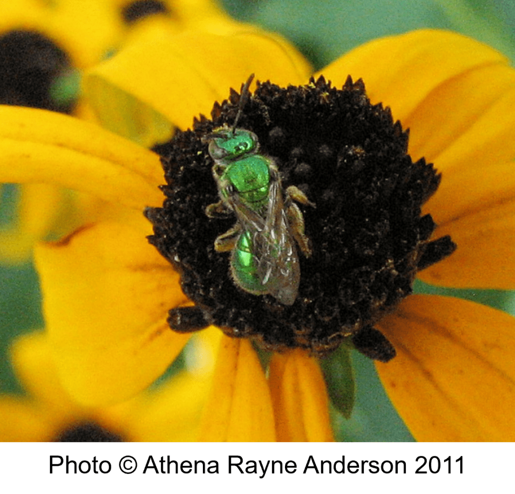 There are many species of bees in this family in Georgia. This is one of the most diverse groups we have, in terms of color variation. Some, like the one pictured here, are metallic green. Others in this family are metallic black, and some are brown with pale stripes. These tend to be smaller than honey bees, and have a habit of licking salts off of sweaty human skin, hence their common name. Females have scopae on their hind legs and nest in the ground. These bees visit many flowers, including those that are very small. Species in this family tend to be most active in summer.