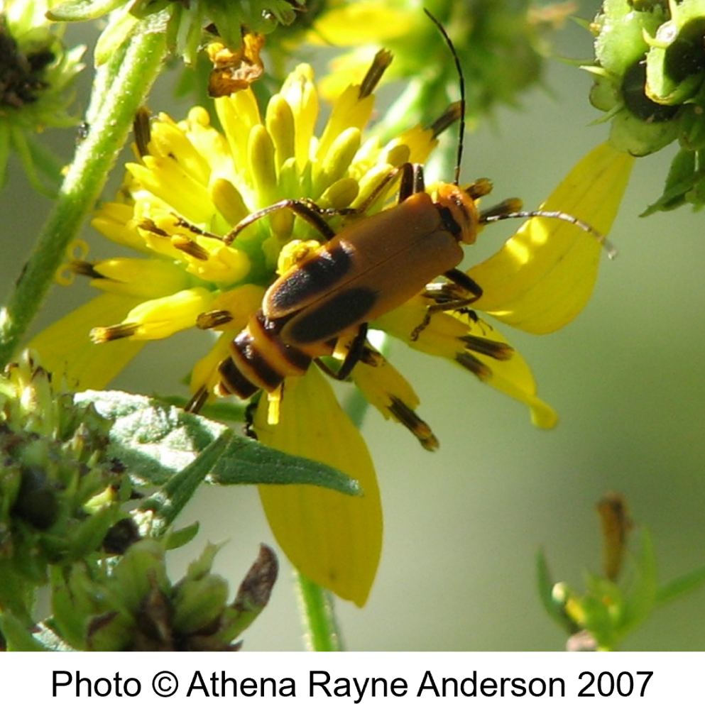 This species is also most abundant on fall flowers, like the goldenrod shown here. It has very distinctive black-and-yellow coloration with red or red-brown legs. These beetles are around 1” long, or slightly longer, and their antennae are at least as long as their bodies. The common name of this species comes from the fact that the larvae live and tunnel around in black locust trees.