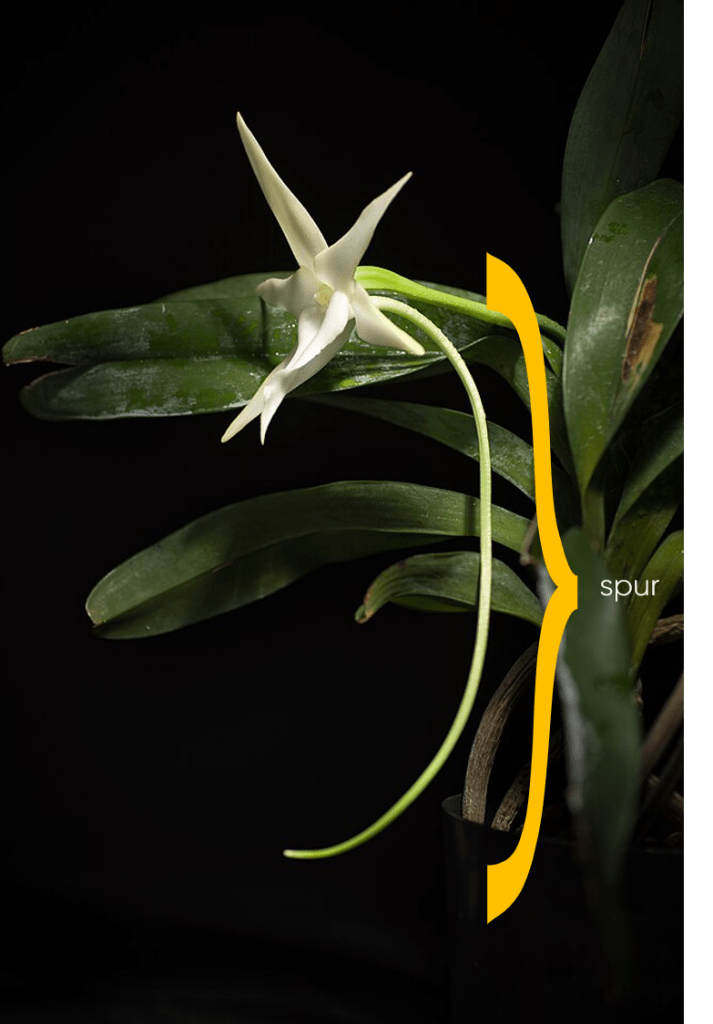 Notice the long spur, which I’ve labeled with an orange bracket. This structure is a tube made of fused petal (corolla) tissue, usually containing nectar at the tip. The opening of this orchid is in the center of the white petals, at the top of the image. The spur in this species can be up to 18″ long! At the time of this orchid’s discovery, the plant’s pollinator was unknown to science.