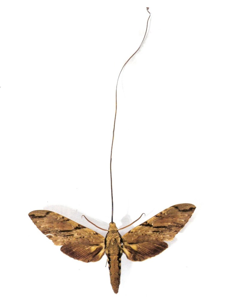 In the article describing the species, Darwin predicted we would eventually discover its pollinator to be a moth with a tongue (proboscis) to approximately match the spur lenth. The scientific community scoffed at this but, in 1903, over 20 years after Darwin’s death, the moth was discovered: Xanthopan morganii. This species (shown here) has a proboscis that is the longest among insects and can range from 6″ – 11.”