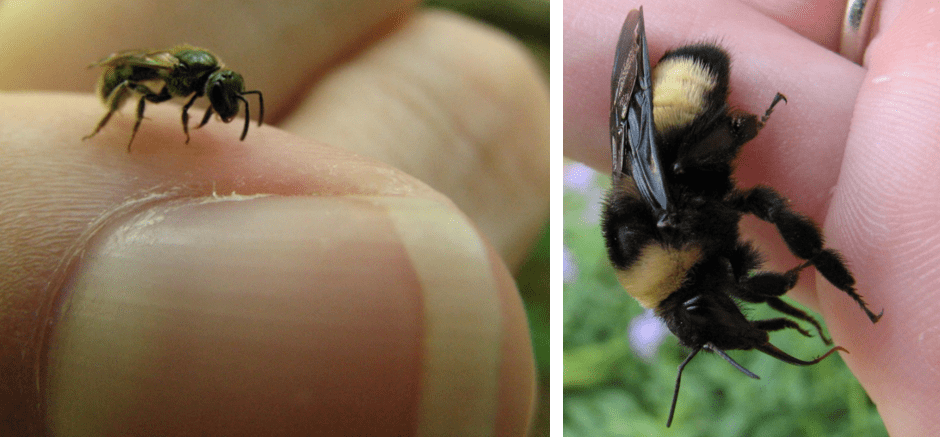 Here are a couple of photos with bees on my hands- the left is a little sweat bee, and the right is a very large bumble bee.