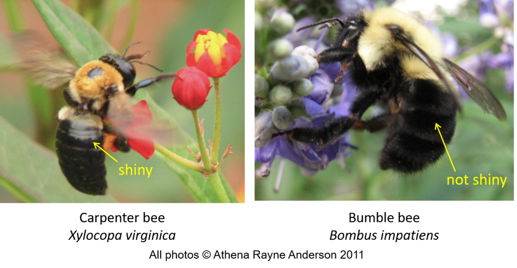 So, how to tell a bumble bee from a carpenter bee? The easiest way for folks in most of North America who are new to this is to see whether the abdomen looks shiny or not. Have a look at the photos above. Does light reflect off the abdomen surface? If YES, you’re looking at a carpenter bee. If NO, it’s a bumble bee. Bumble bees are fuzzy, and their abdomens don’t look shiny as a result of all the hair.