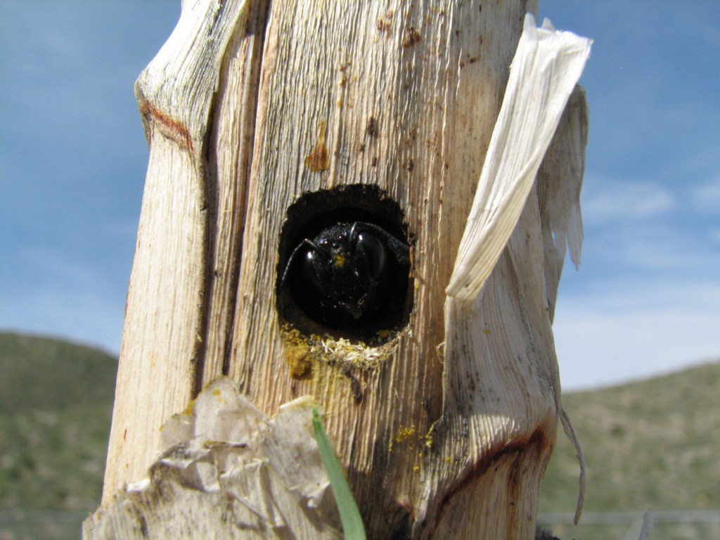 The bees have few places to nest in the “wild,” so they do the best they can with other wood sources. This photo shows a female carpenter bee nesting in a natural location: a sotol stem in Texas.