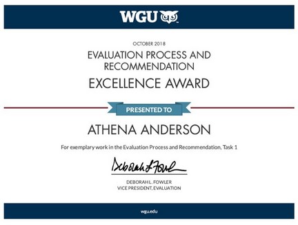 This evaluation is for a course I designed and taught for Ivy Tech Community College in Indiana. My evaluation won an Excellence Award from Western Governors University’s Evaluation Department and the evaluator made these comments about my work. View the SlideShare below.